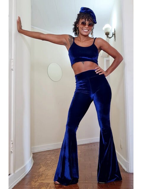 Calça boca de sino em veludo com elastano, cós largo, que vai te transportar pros anos 70.