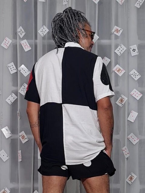 Camisa sem gênero com modelagem tradicional, manga curta e botões escondidos.