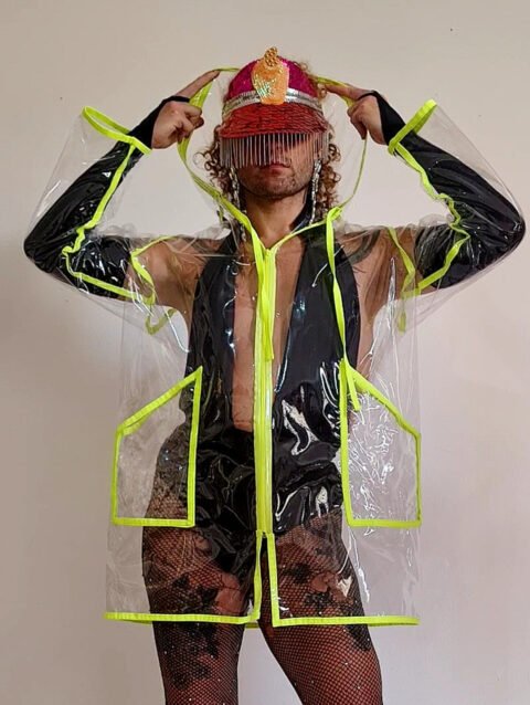Capa de chuva de plástico com viés em néon de alerta para tempestades carnavalescas.