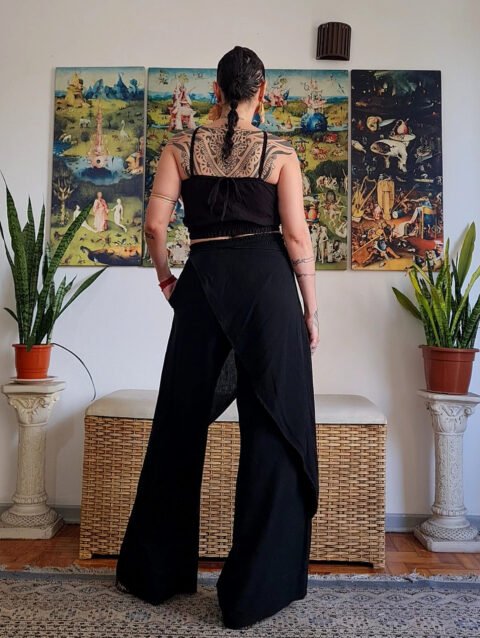 Calça as pernas amplas, com abas nas laterais que permitem variás formas de usar.
