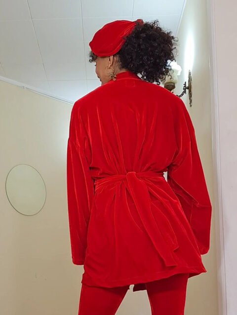Uma peça meio kimono meio blaser, com toda a lindeza da malha de veludo. Vem com cinto do próprio tecido avulso.