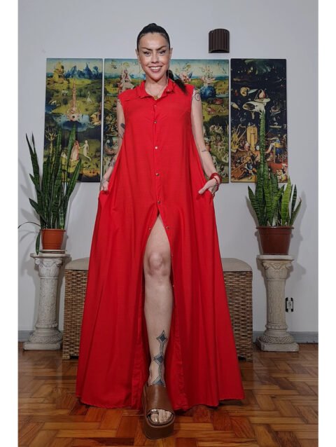 Vestido longo, evasê, com fendas nas laterais e alças reguláveis.