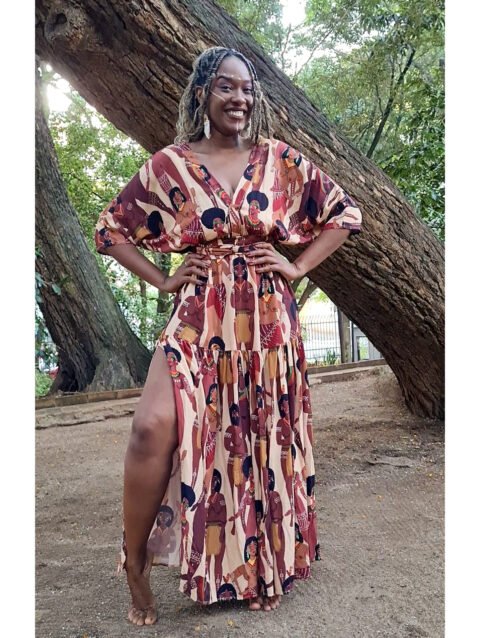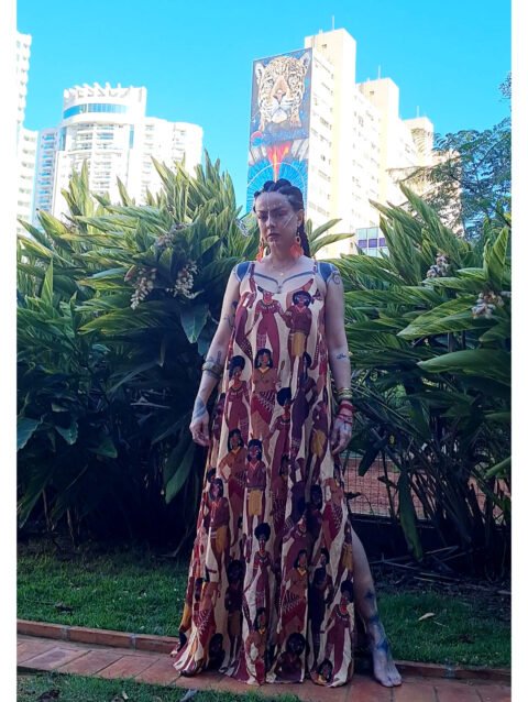 Vestido longo, evasê, com fendas nas laterais e alças reguláveis.