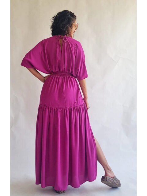 Vestido com camadas de saias franzidas, com o busto com alças que podem ser usadas de várias formas.