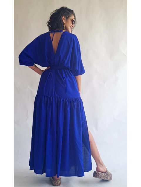 Vestido longo, evasê, com fendas nas laterais e alças reguláveis.