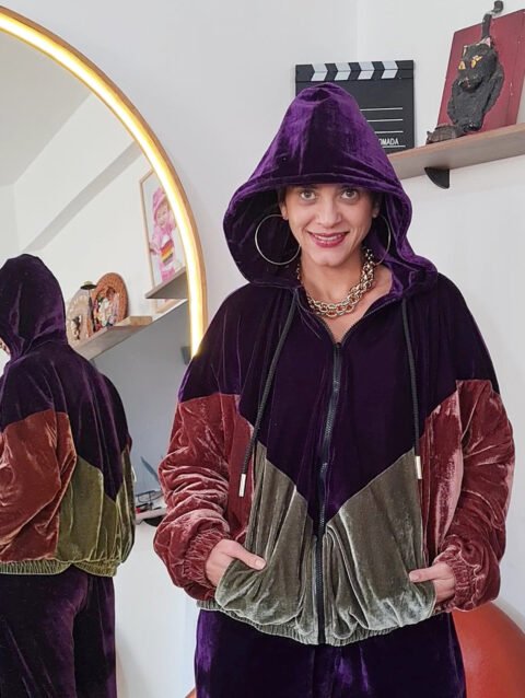 BLUSÃO FÊNIX RECORTES VELUDO ROXO BERINJELA E VERDE