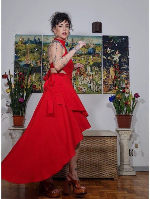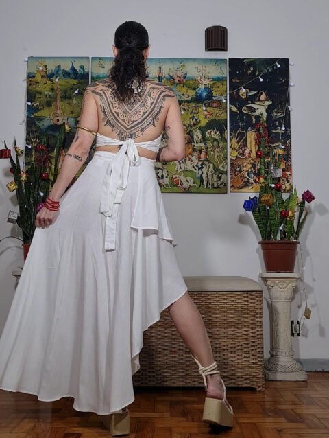 Saia transpassada meio godê que amarra na cintura ajustável e pode ser usada como vestido.