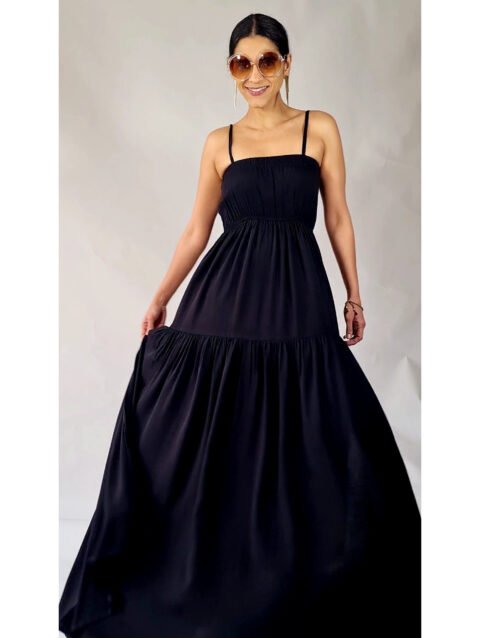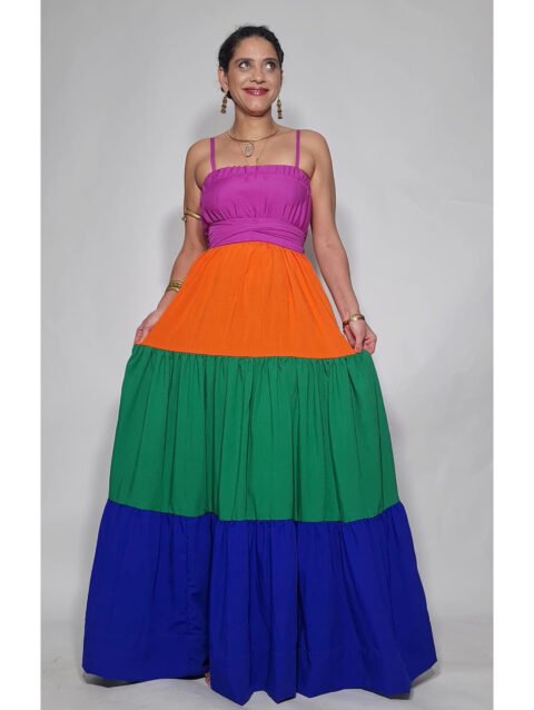Vestido com camadas de saias franzidas, com o busto com alças que podem ser usadas de várias formas e vem com um cinto avulso do próprio tecido