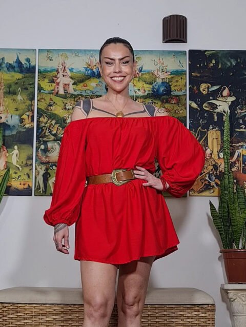 Todo o charme do um-ombro-só somado a manga dramática. Vem com cinto do próprio tecido para acinturar.