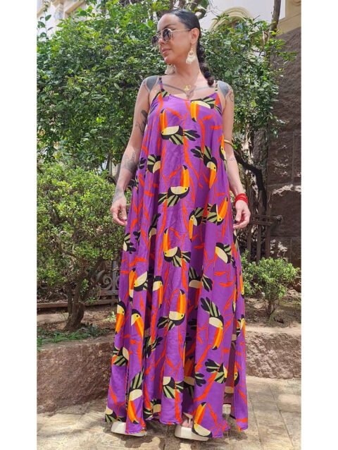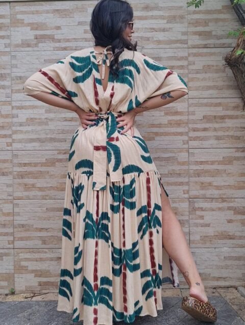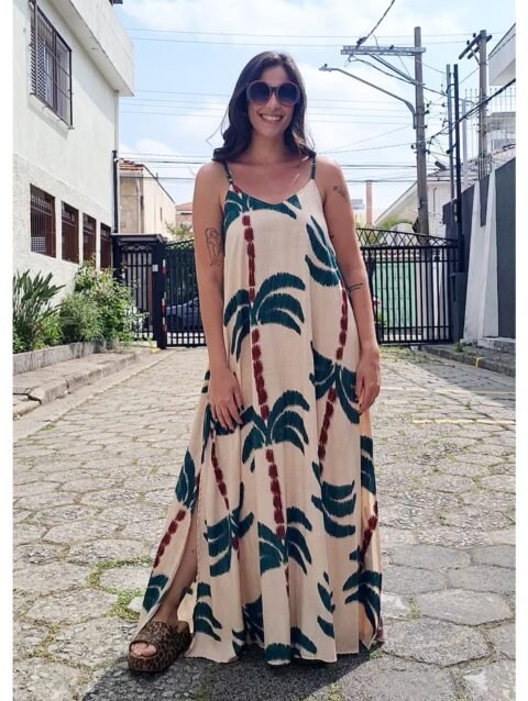 Vestido longo, evasê, com fendas nas laterais e alças reguláveis.
