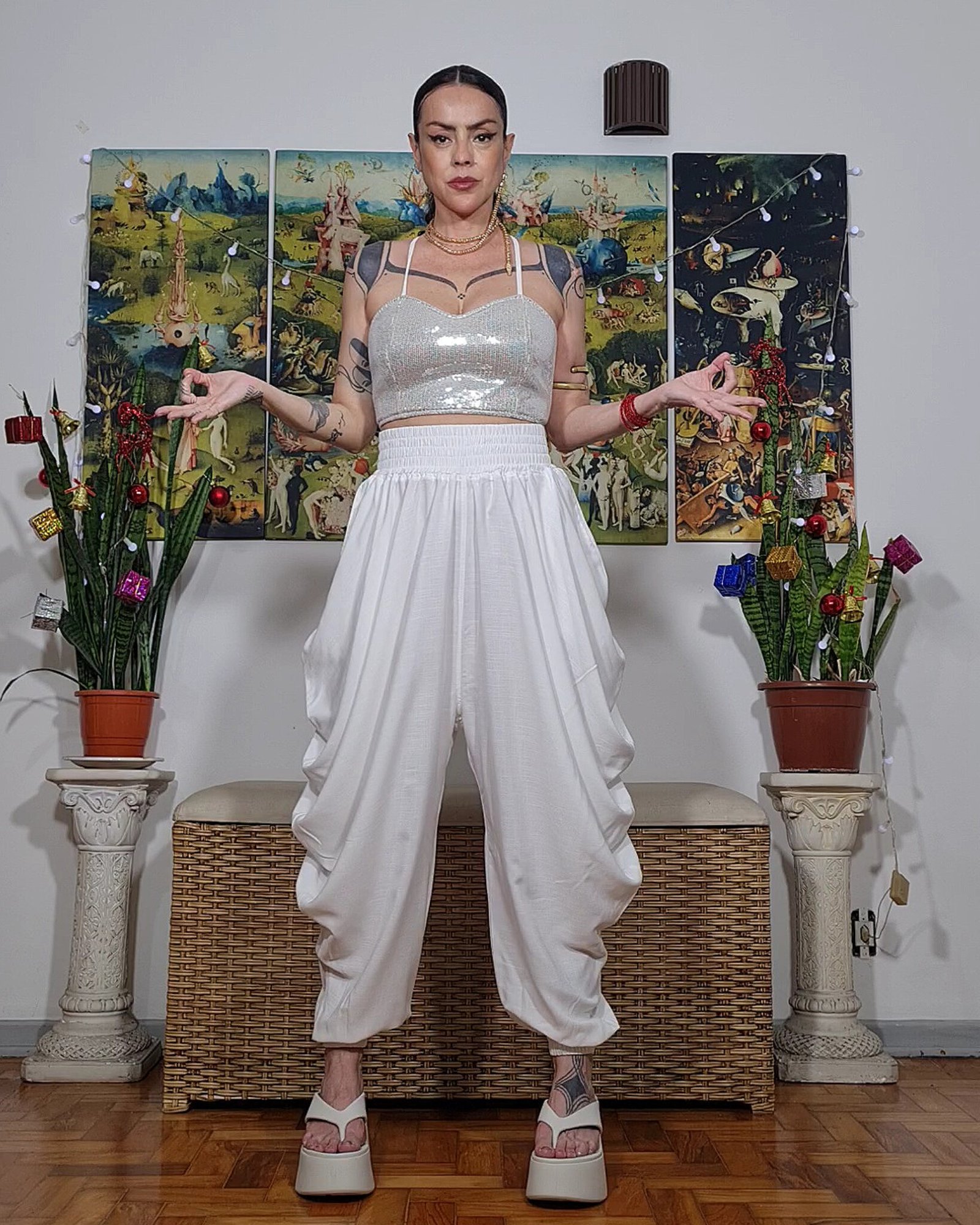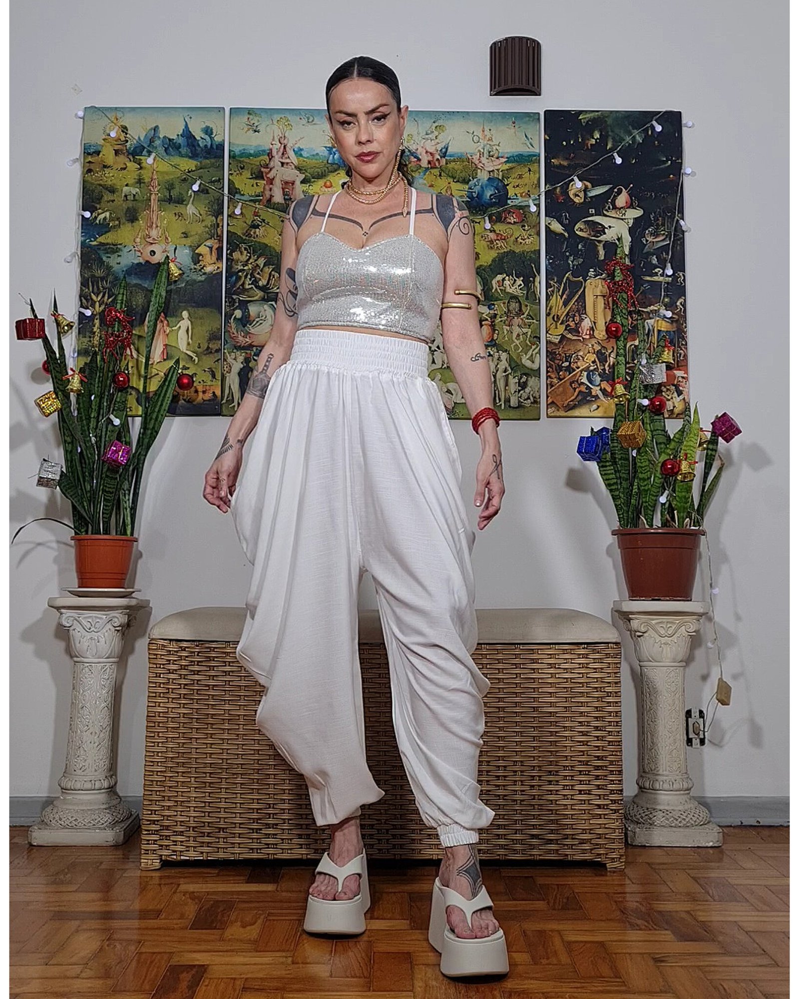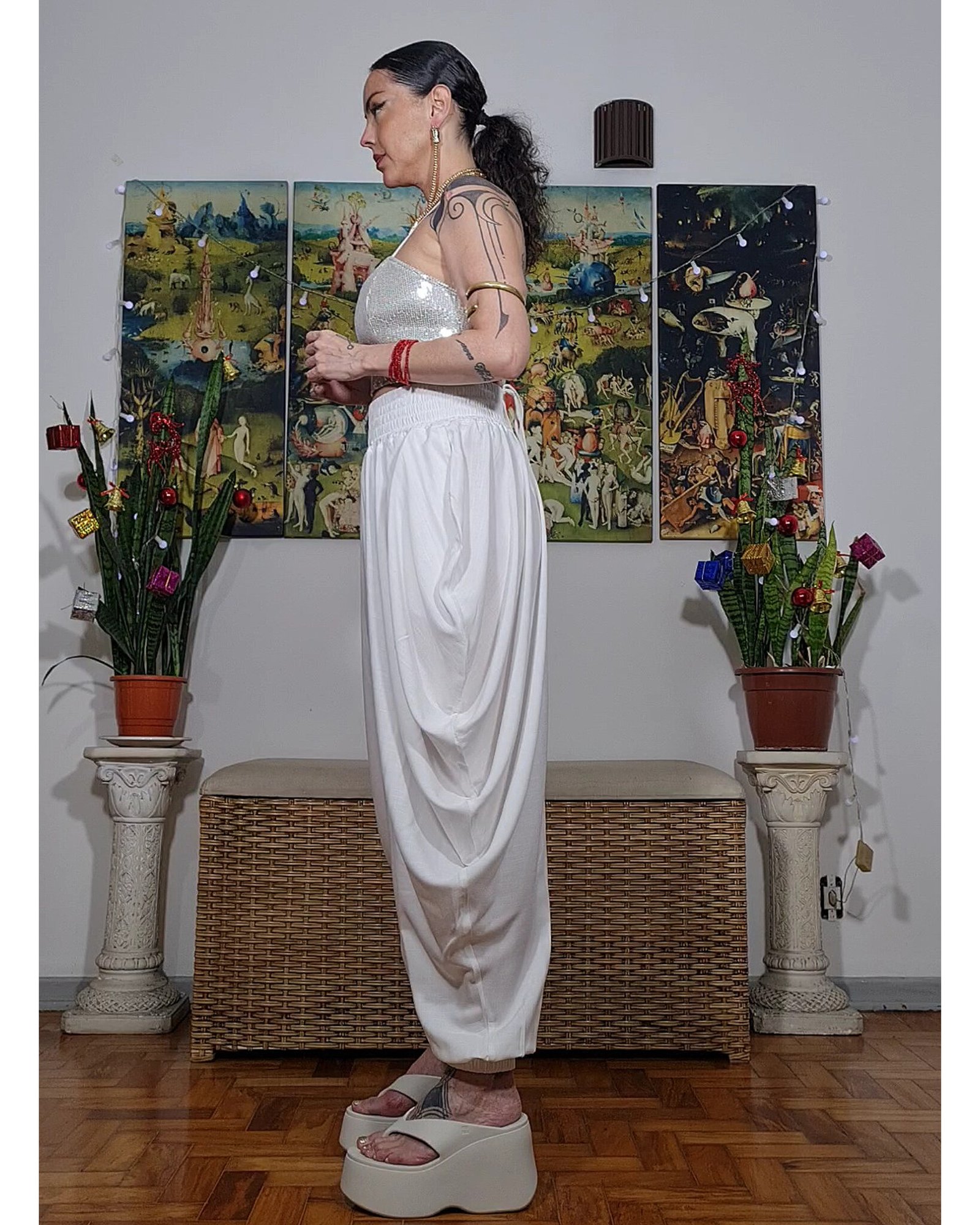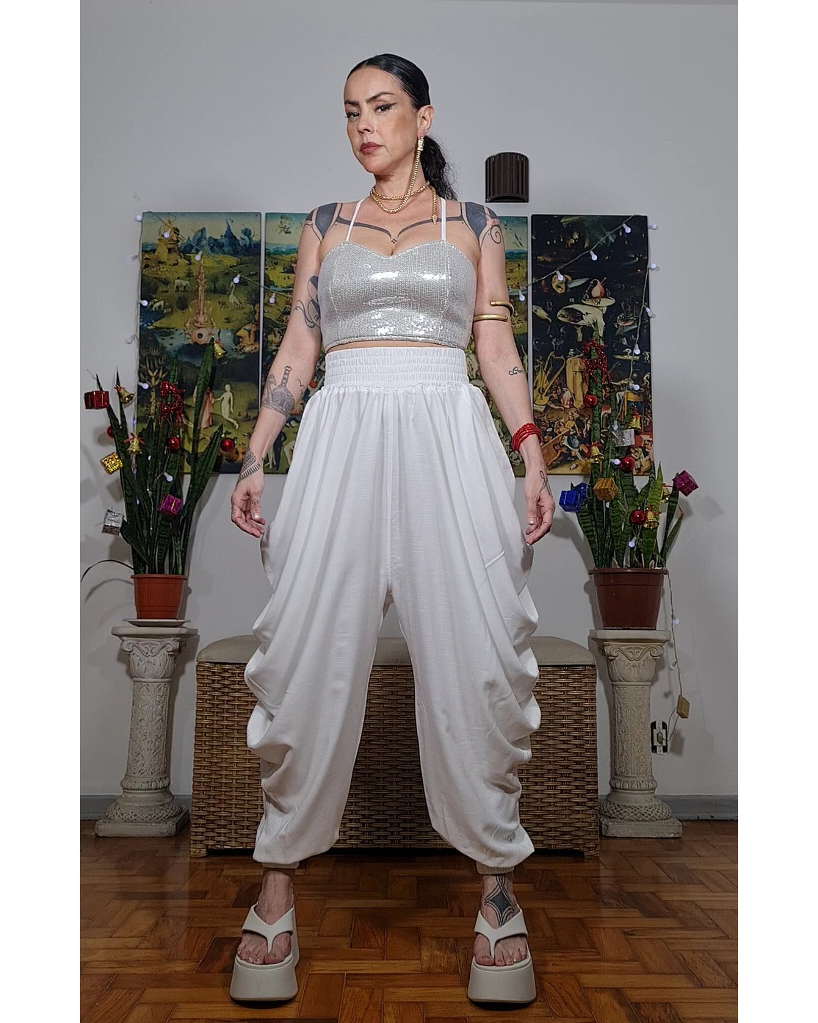 Calça franzida que forma uma cascata nas laterais, agenero, perfeita!