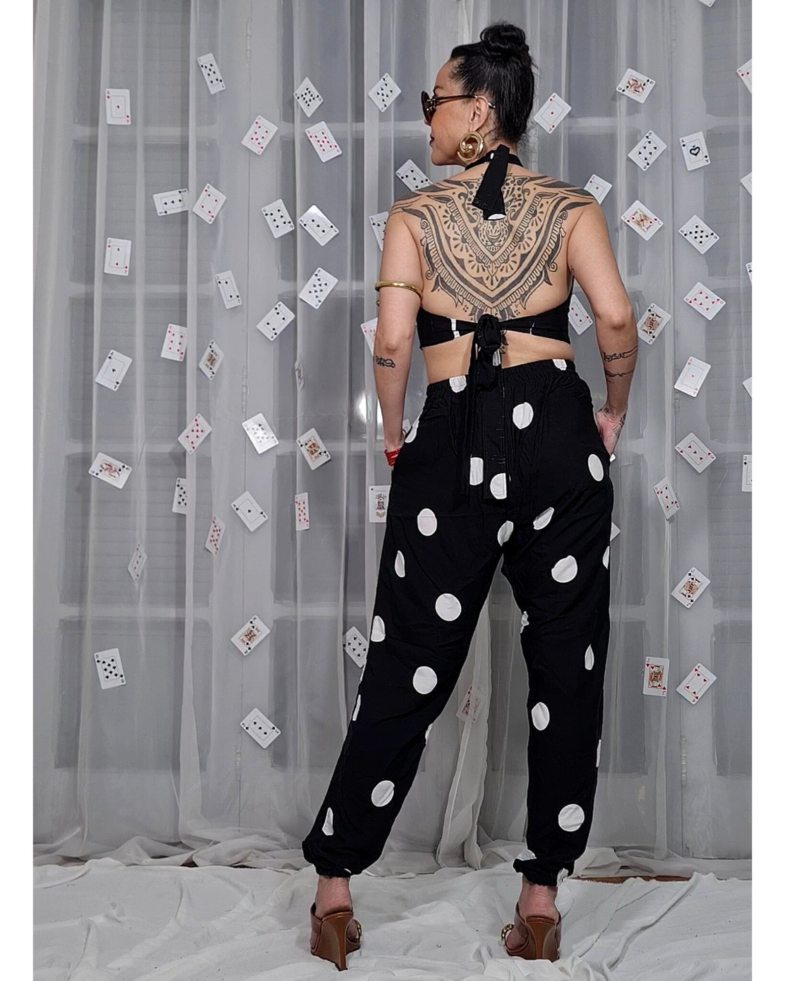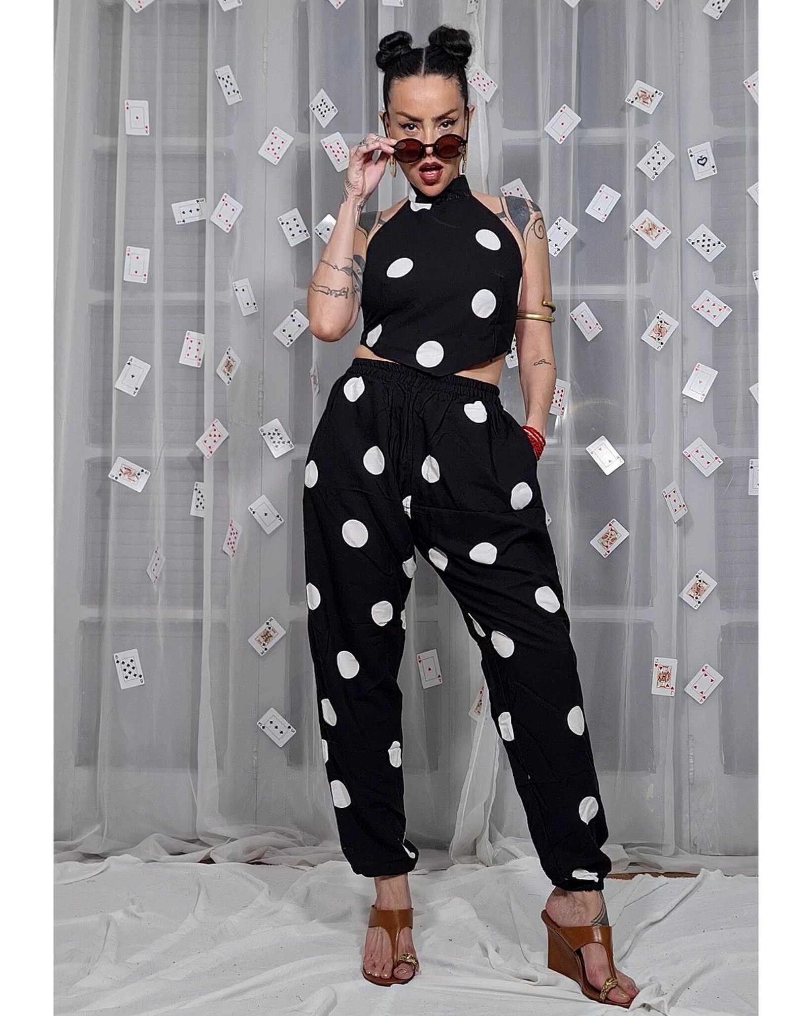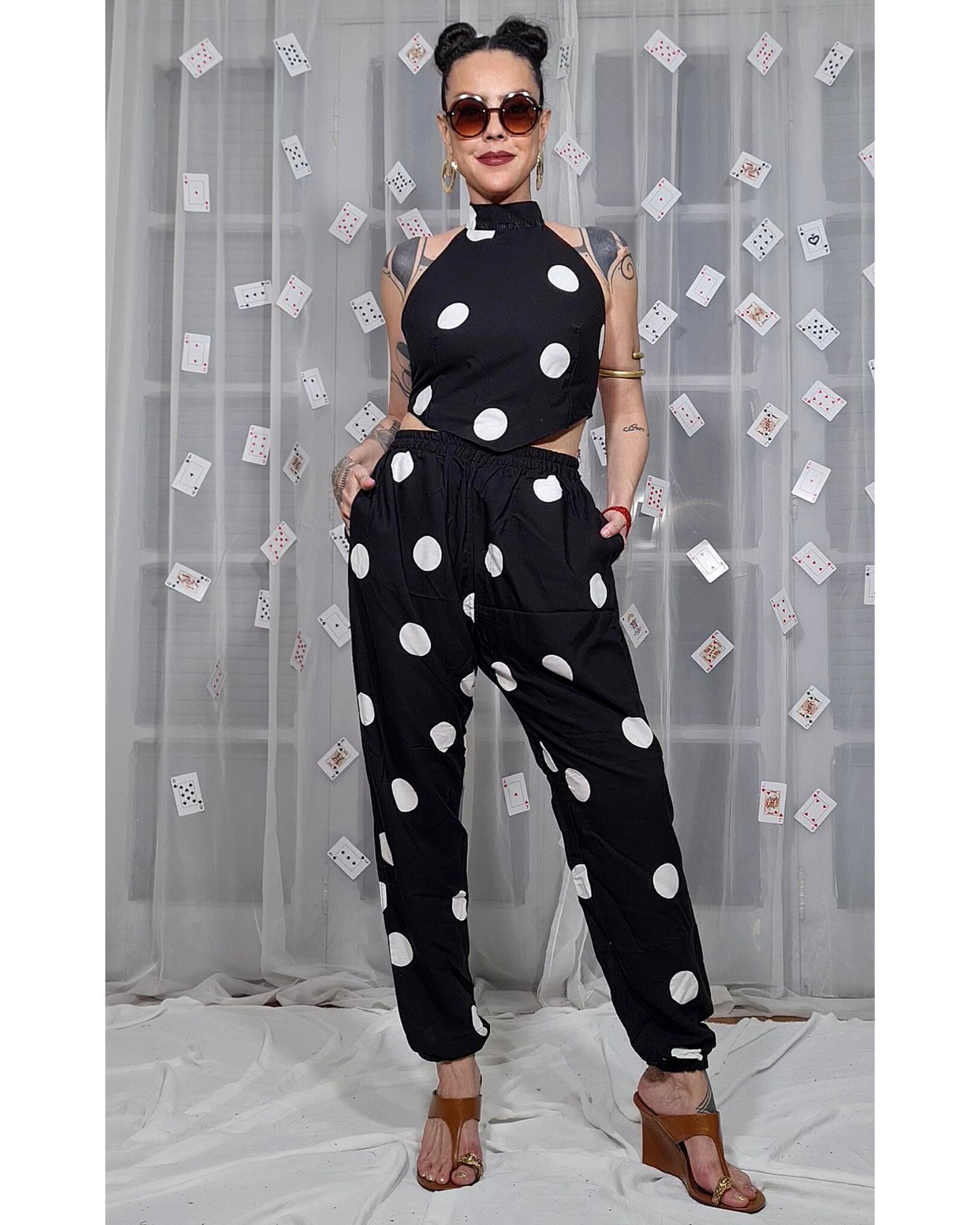 Calça mais sequinha com elástico de 4cm de largura na cintura, elásticos de 1cm nas barras das pernas e bolsos nas laterais.