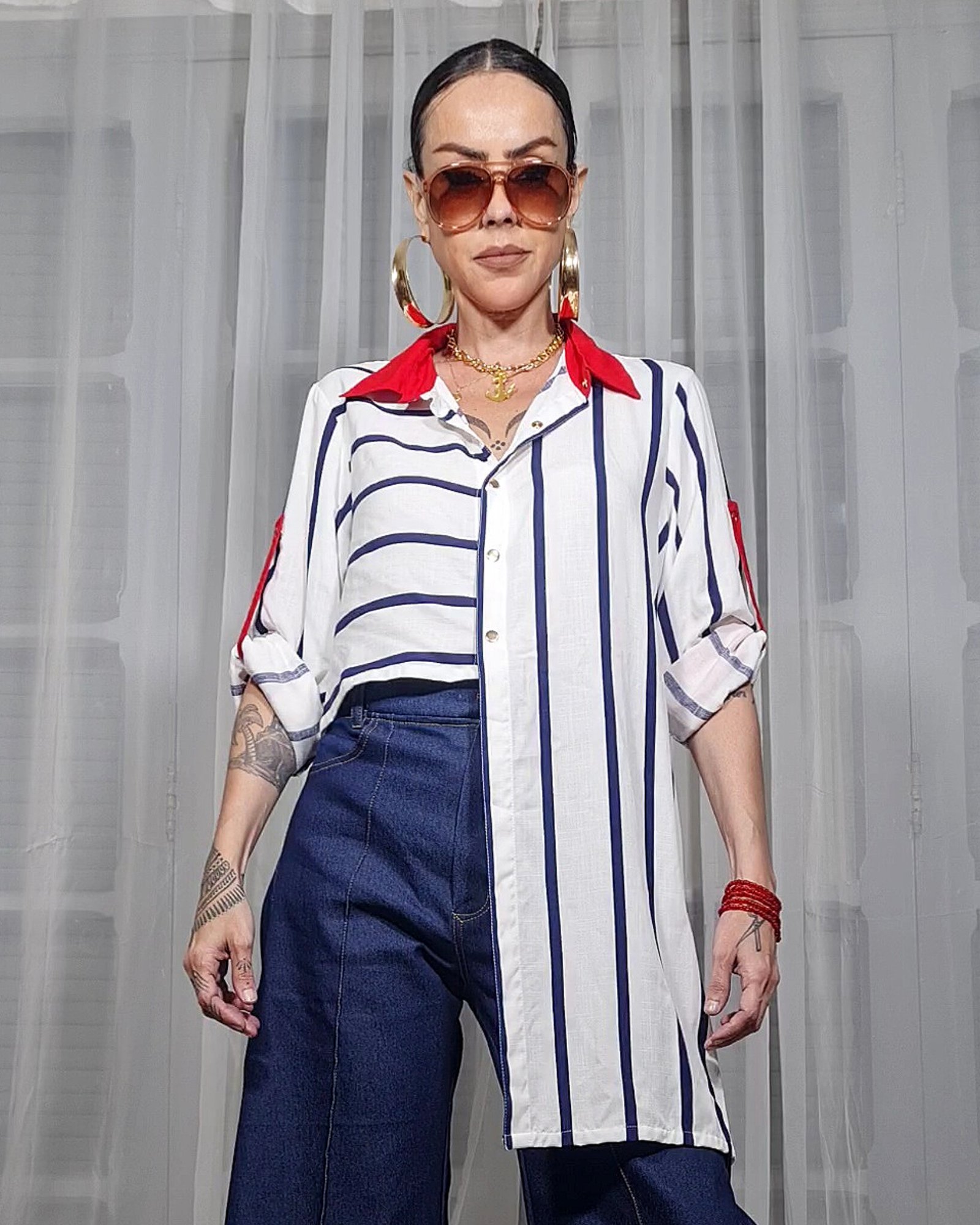 Camisa agenero metade cropped, metade comprida.