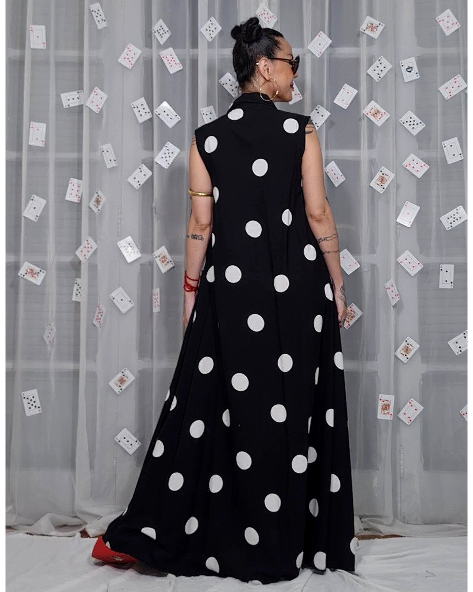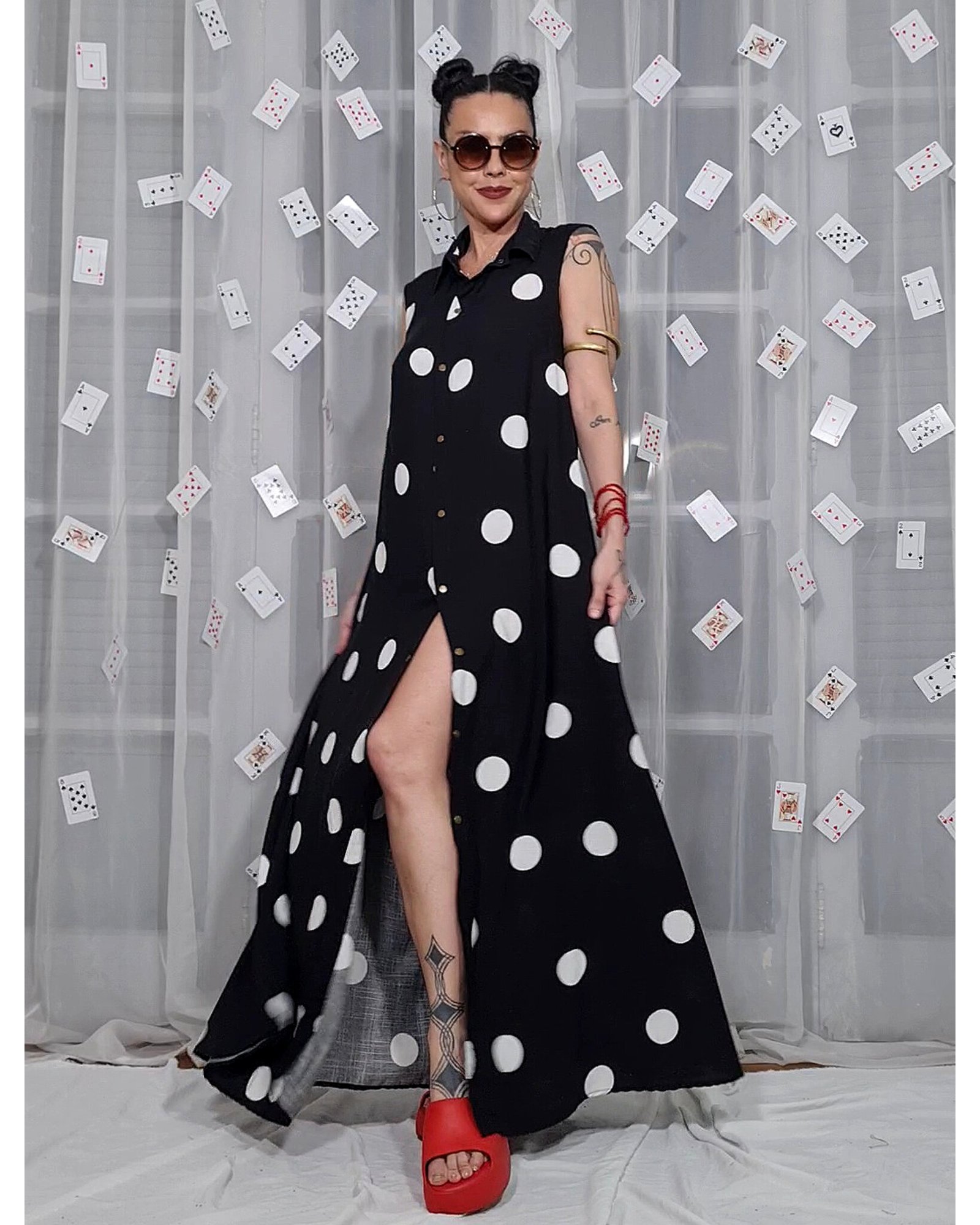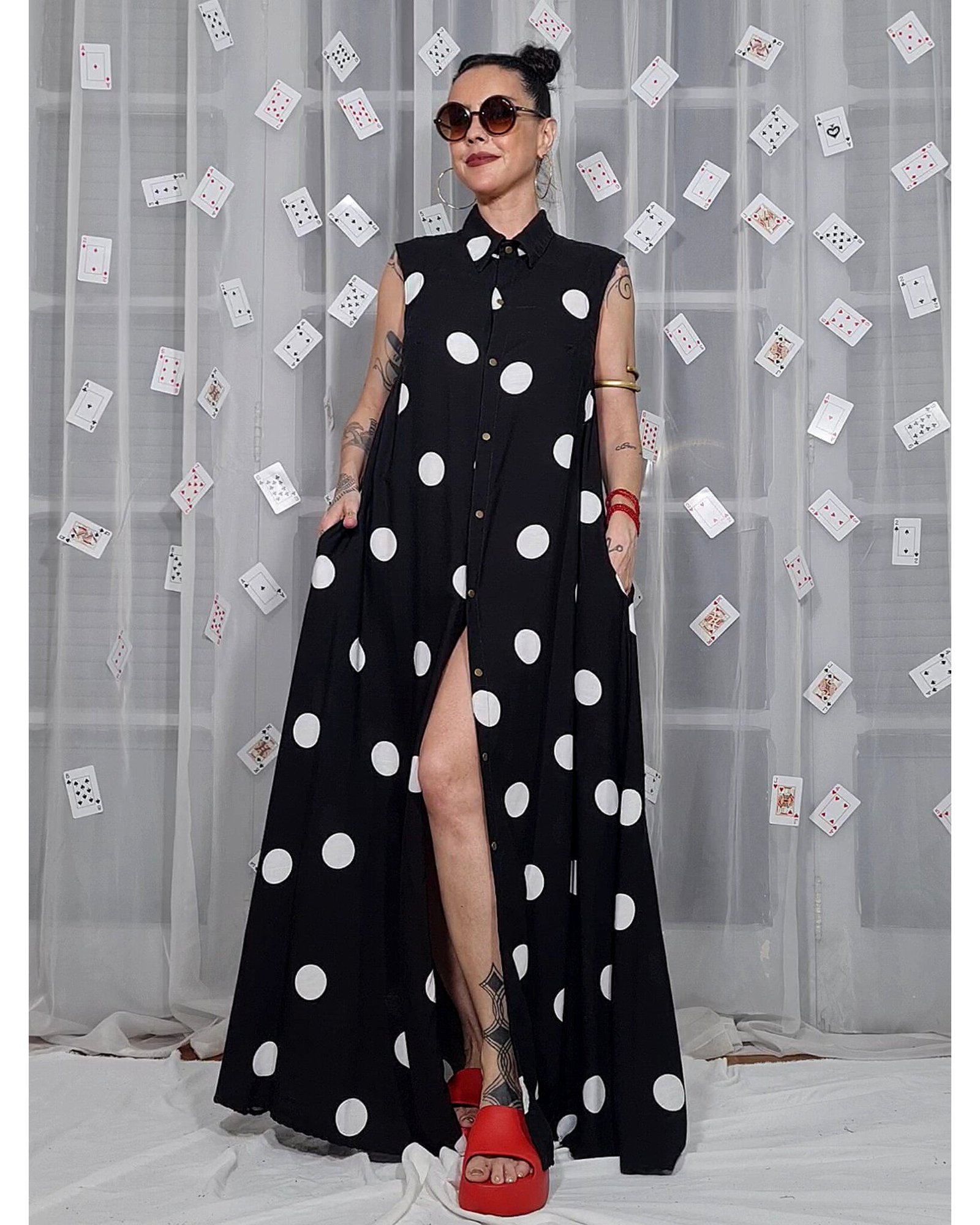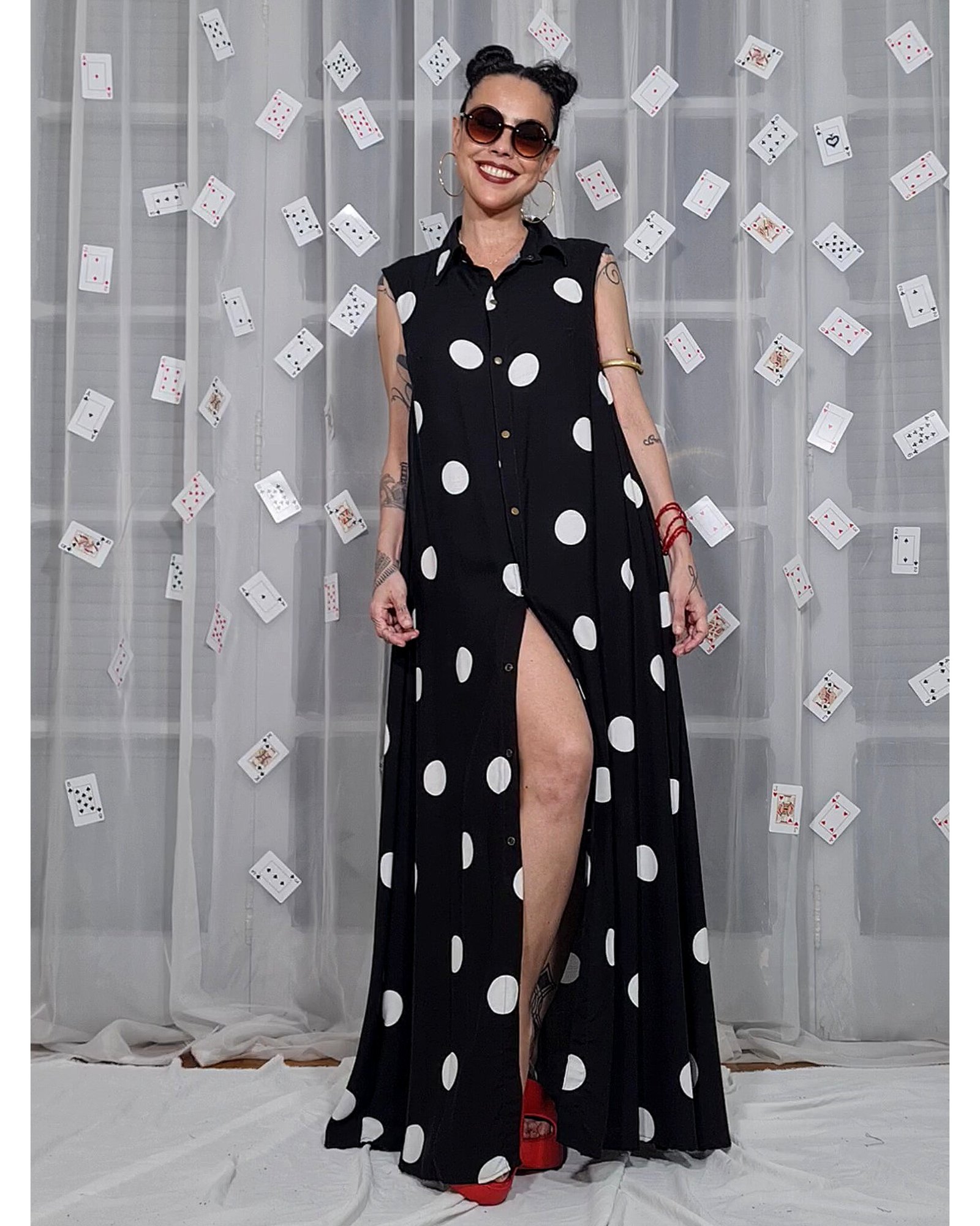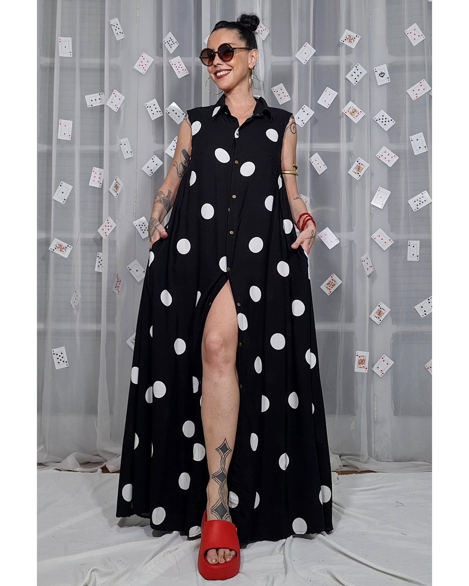 Vestido longo, evasê, com fendas nas laterais e alças reguláveis.