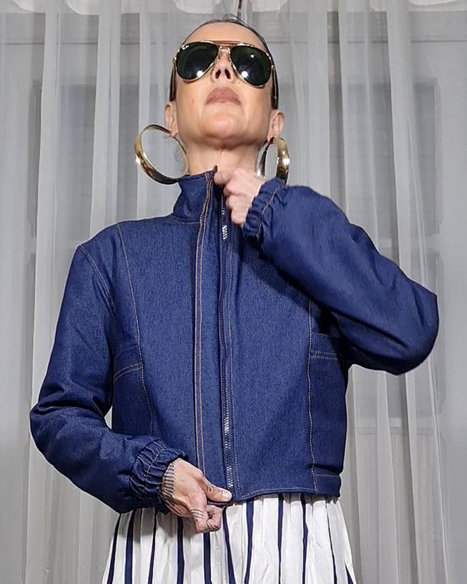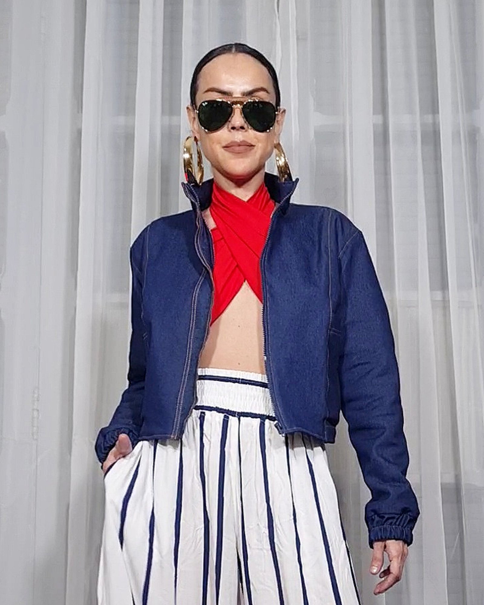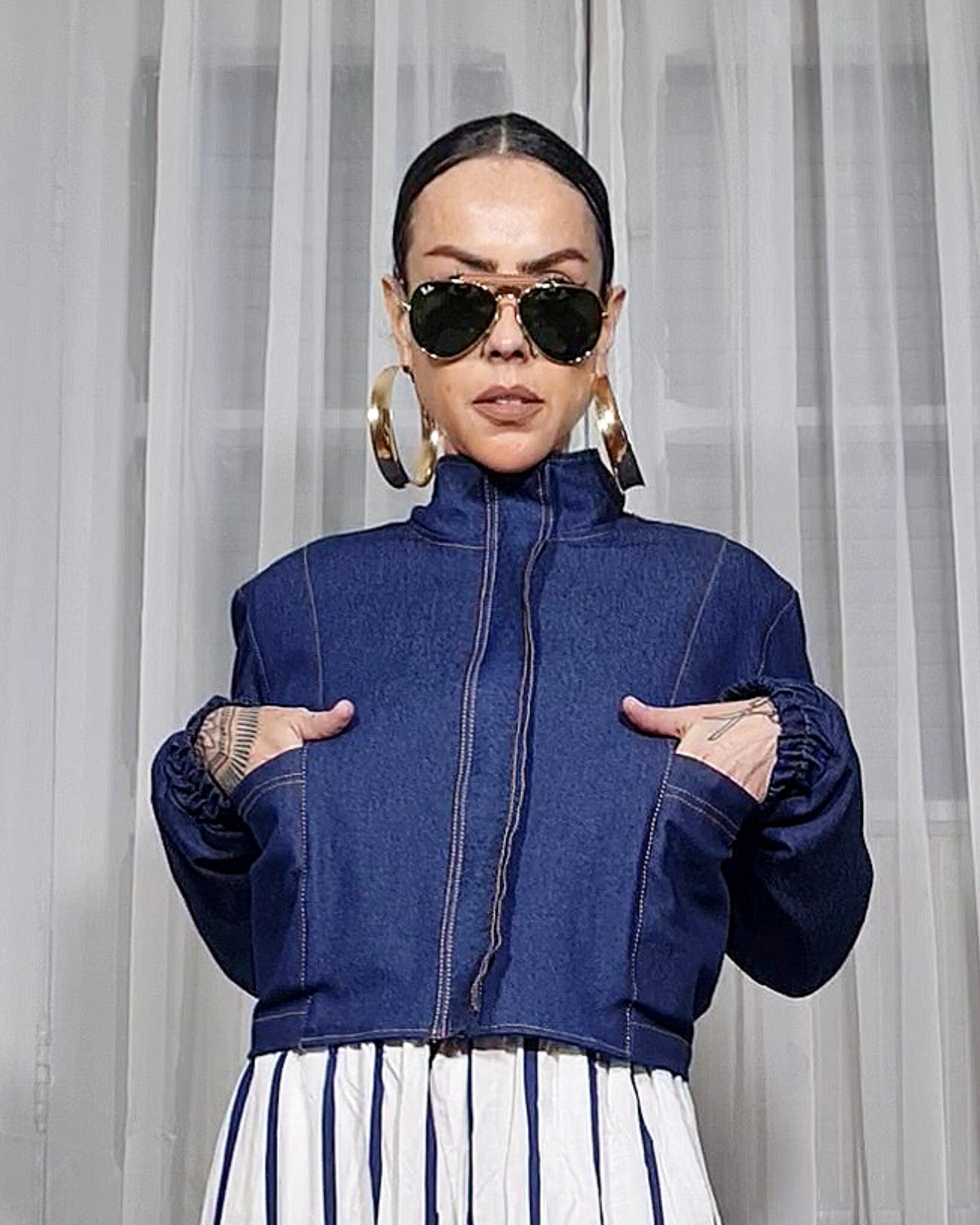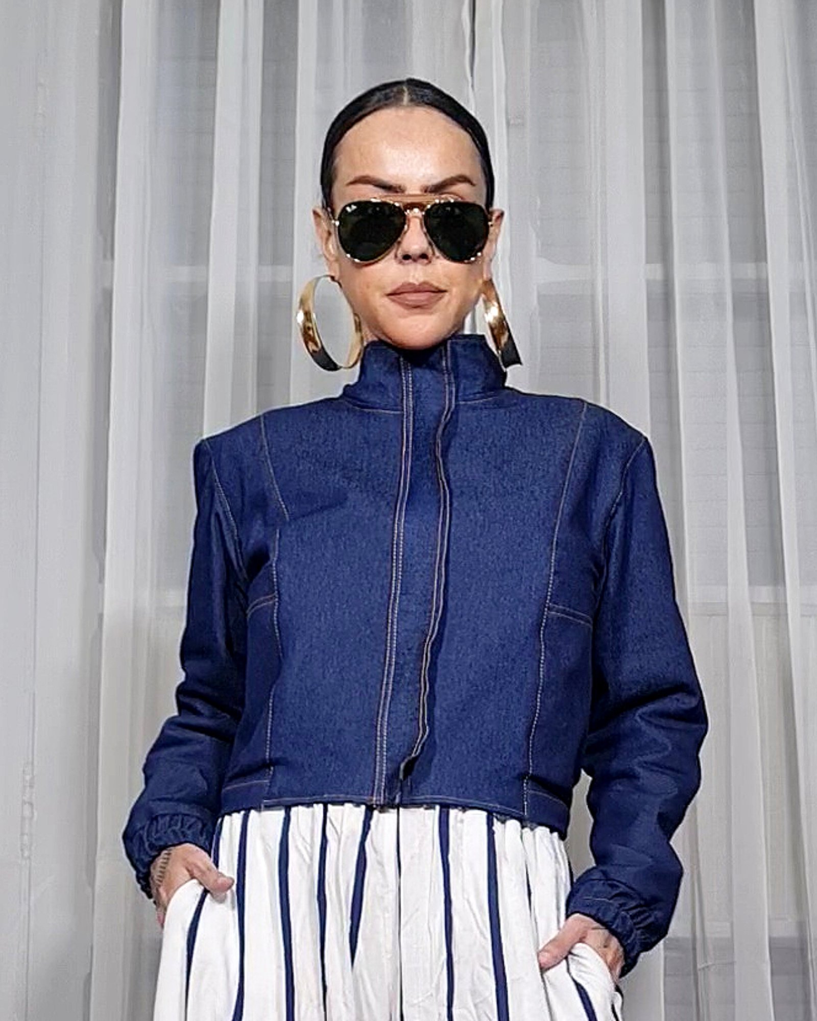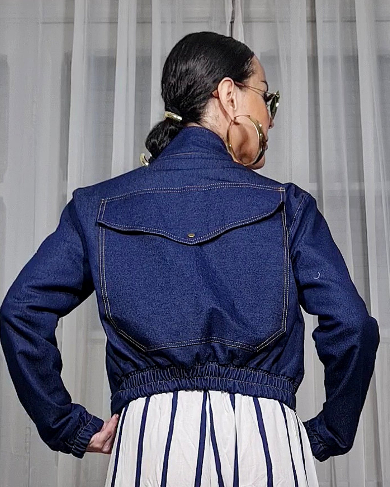 Jaqueta curta com bolsos dianteiros, bolso traseiro em formato de carta atrás, meio elástico no cós das costas e fechamento frontal com zíper.