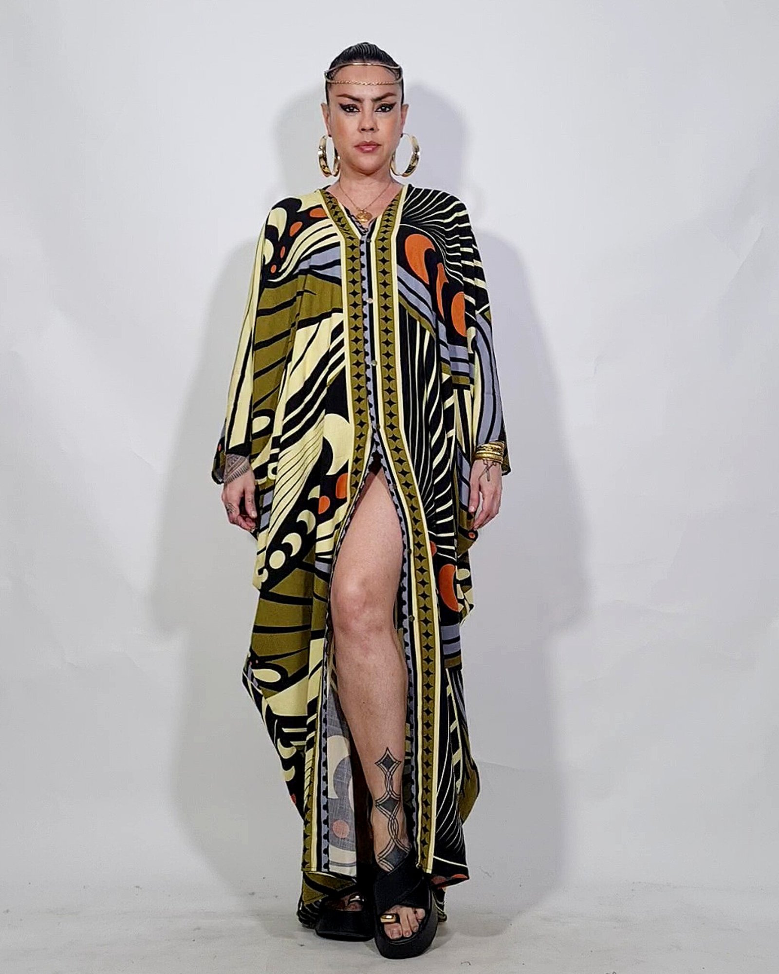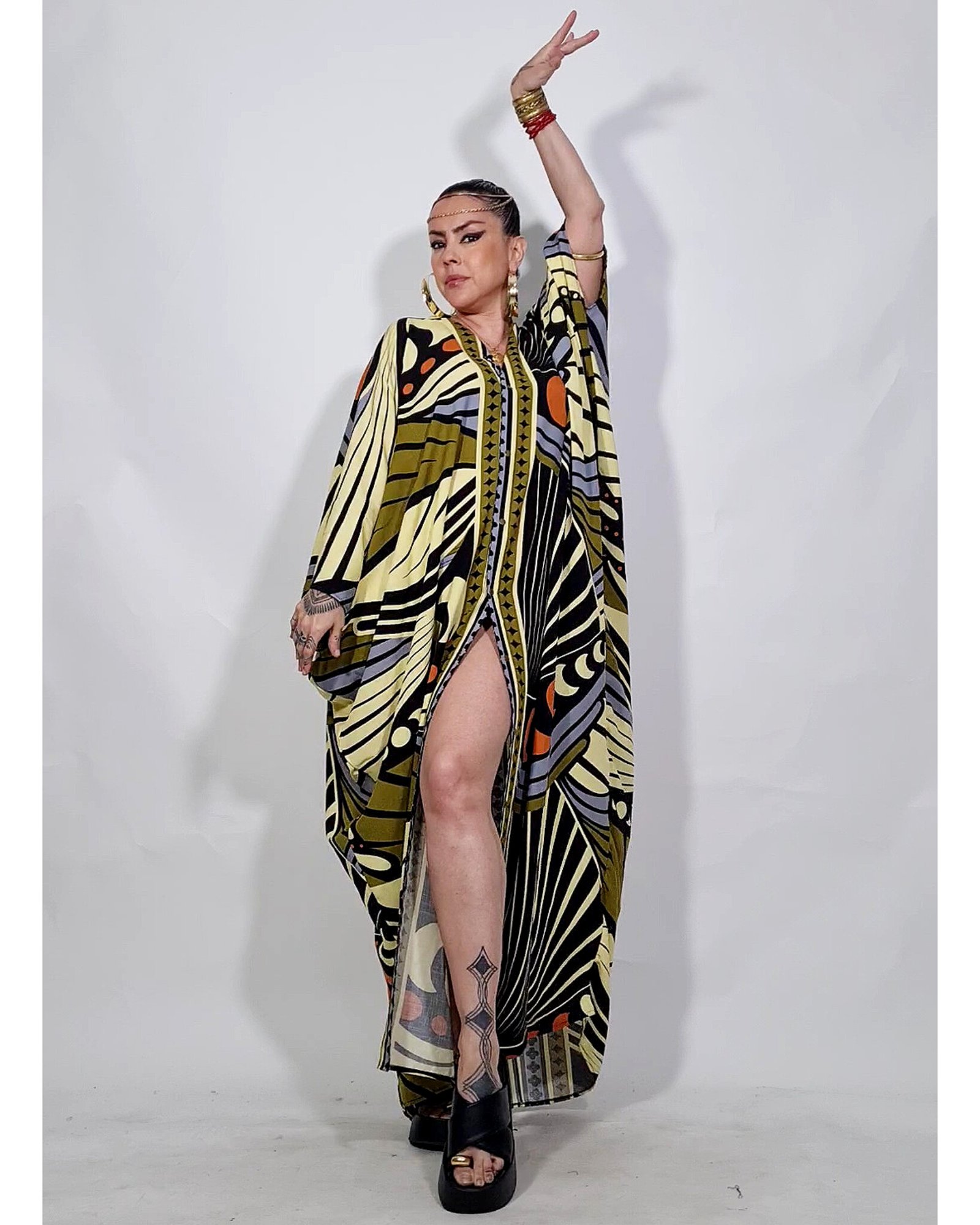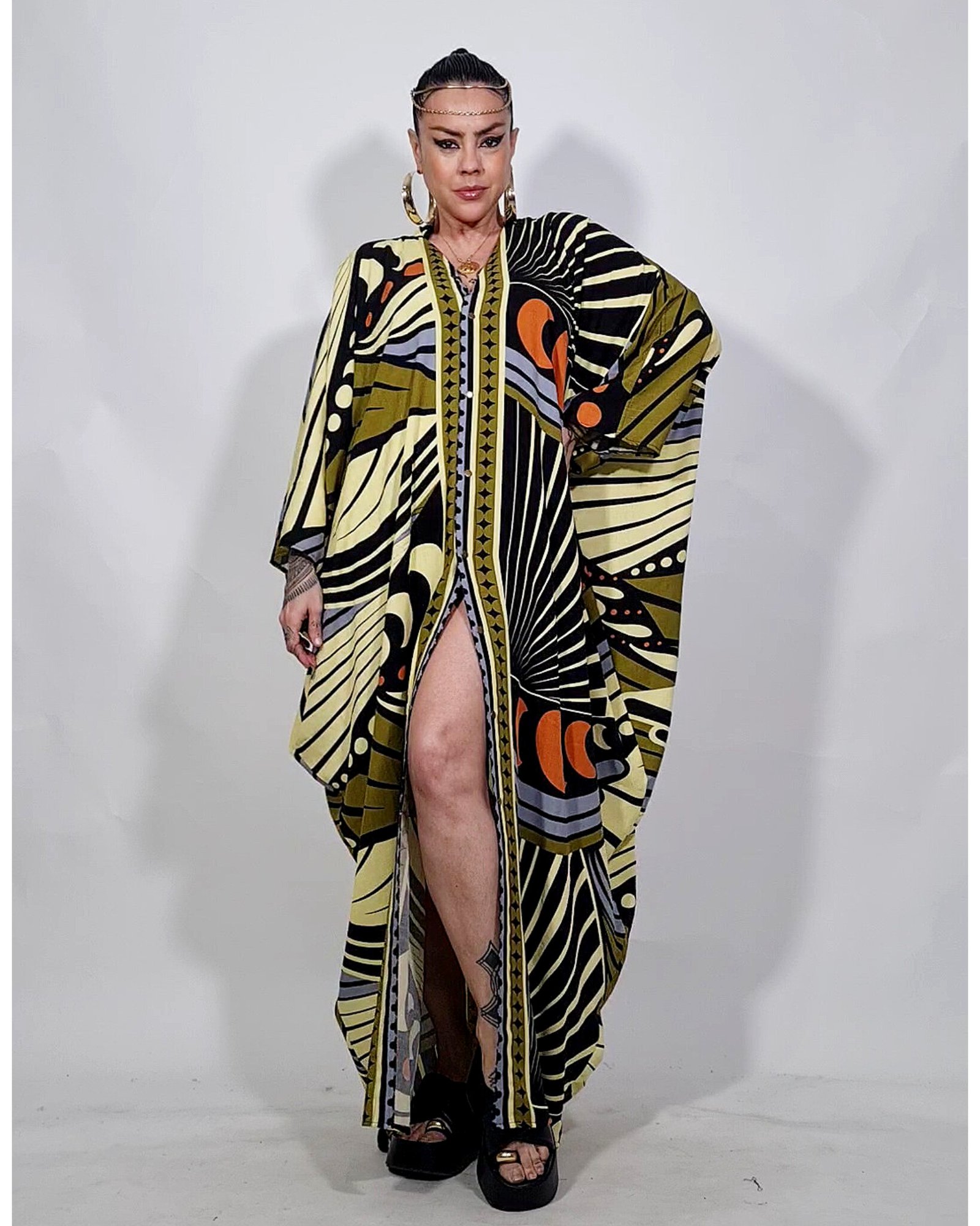 Kaftan amplo, tamanho único, com fechamento frontal de botões. Tem 2 metros de circunferência e 1,30m de comprimento. Possui cintinho interno para acinturar.