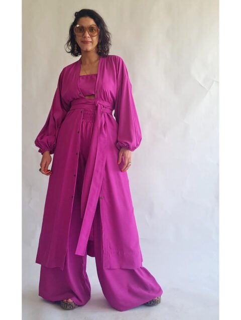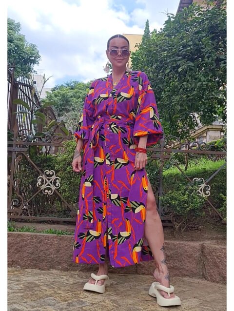 Kimono tamanho único com manga tulipa, com elásticos nos punhos das mangas.