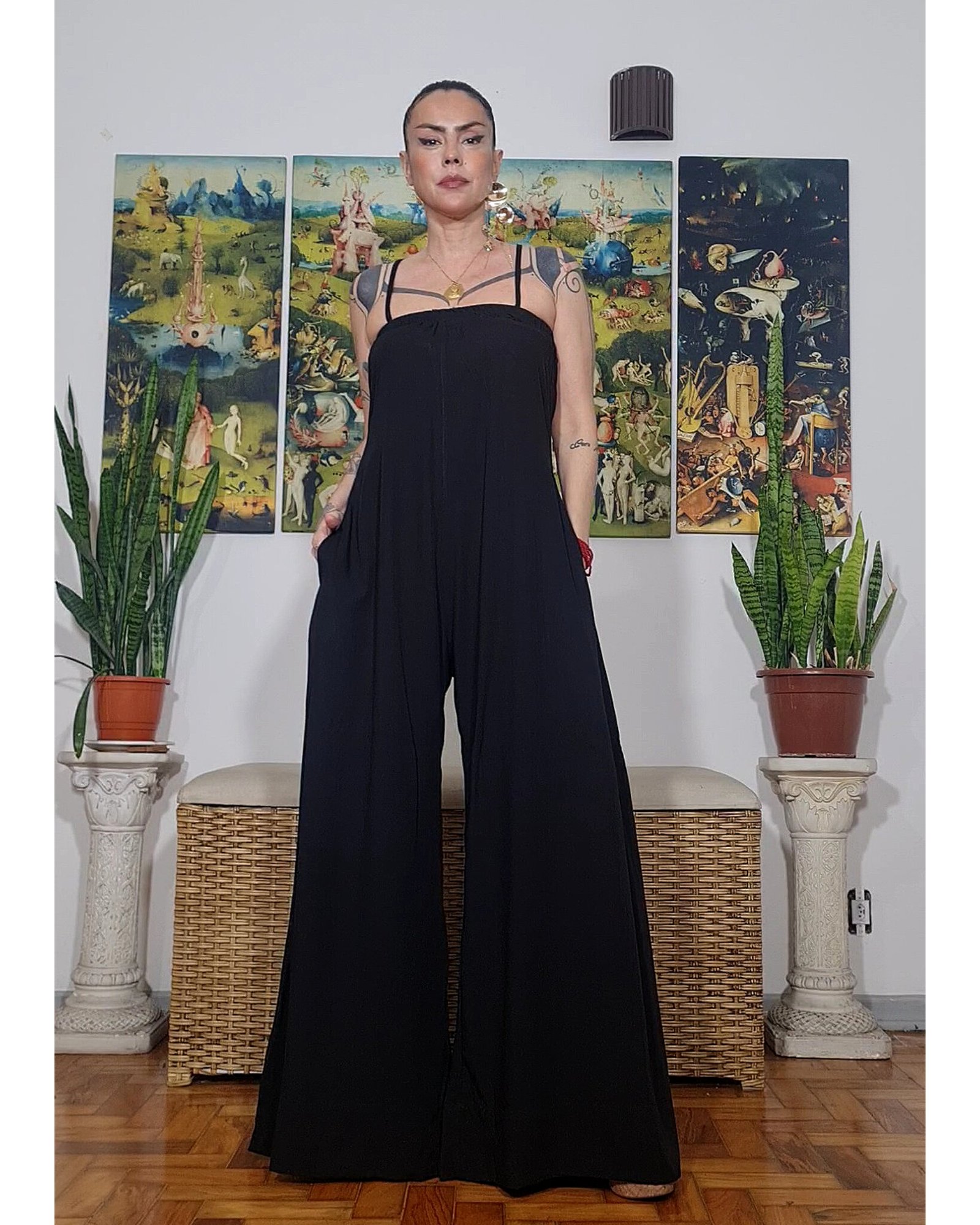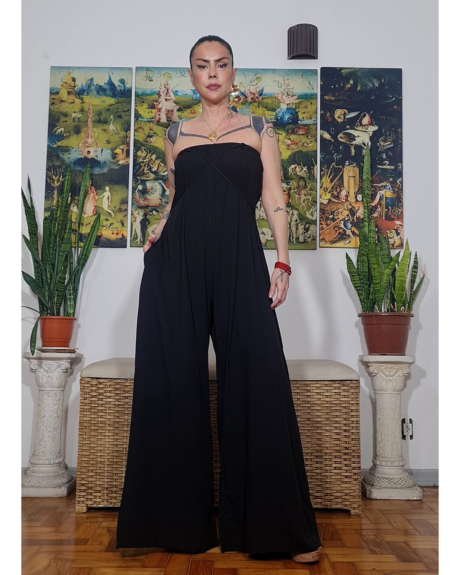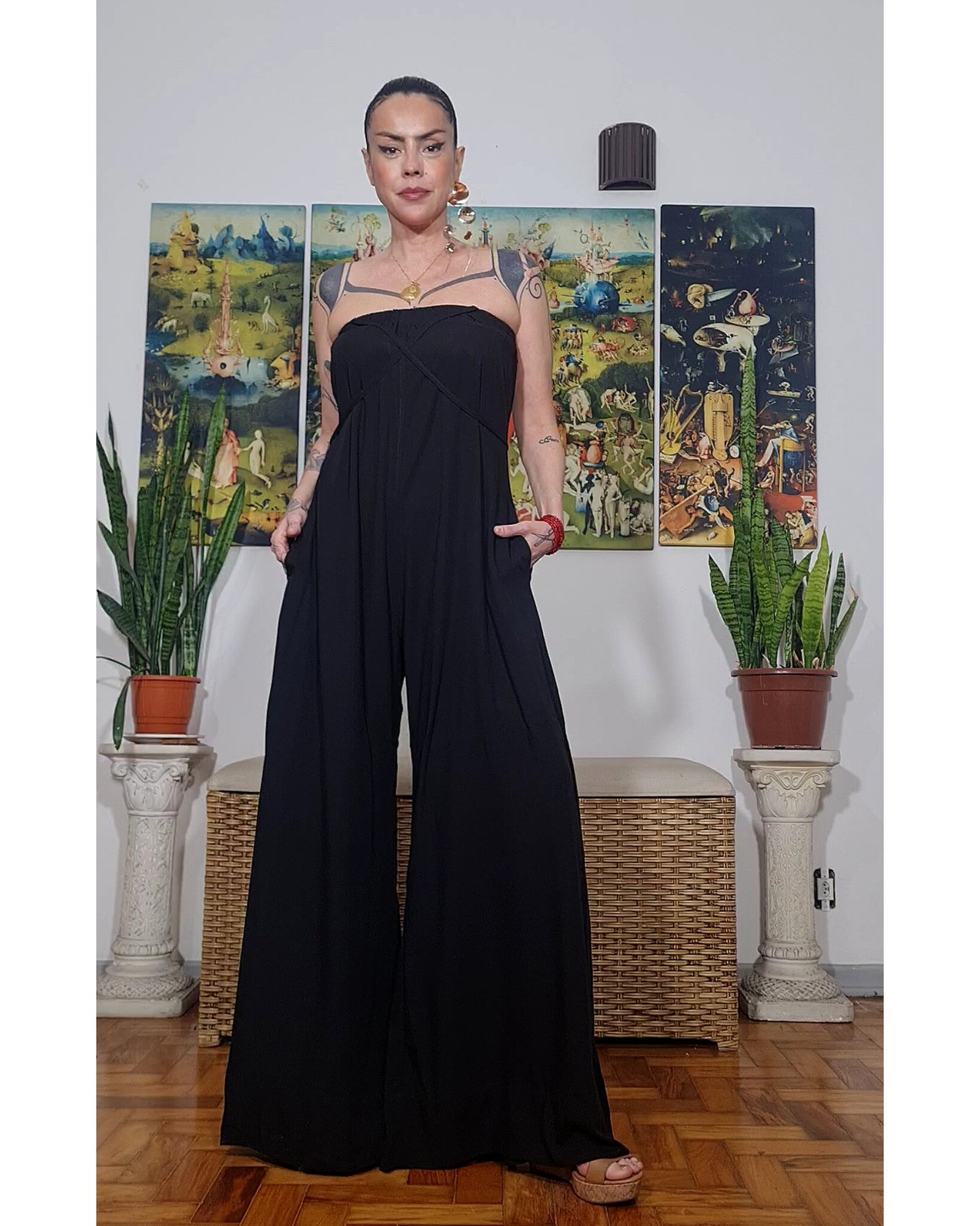 Macacão tomara-que-caia, com alças que possibilitam fazer vários tipos de amarrações e pernas pantalonas.
