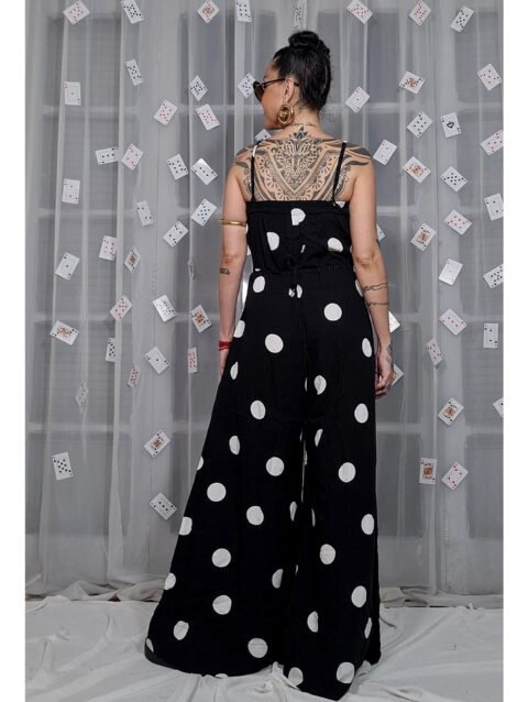 Macacão amplo, com alças que possibilitam fazer vários tipos de amarrações, e ainda vem com cinto do próprio tecido para acinturar.