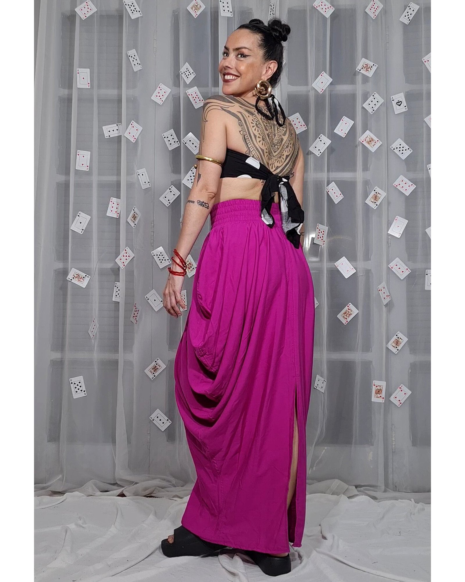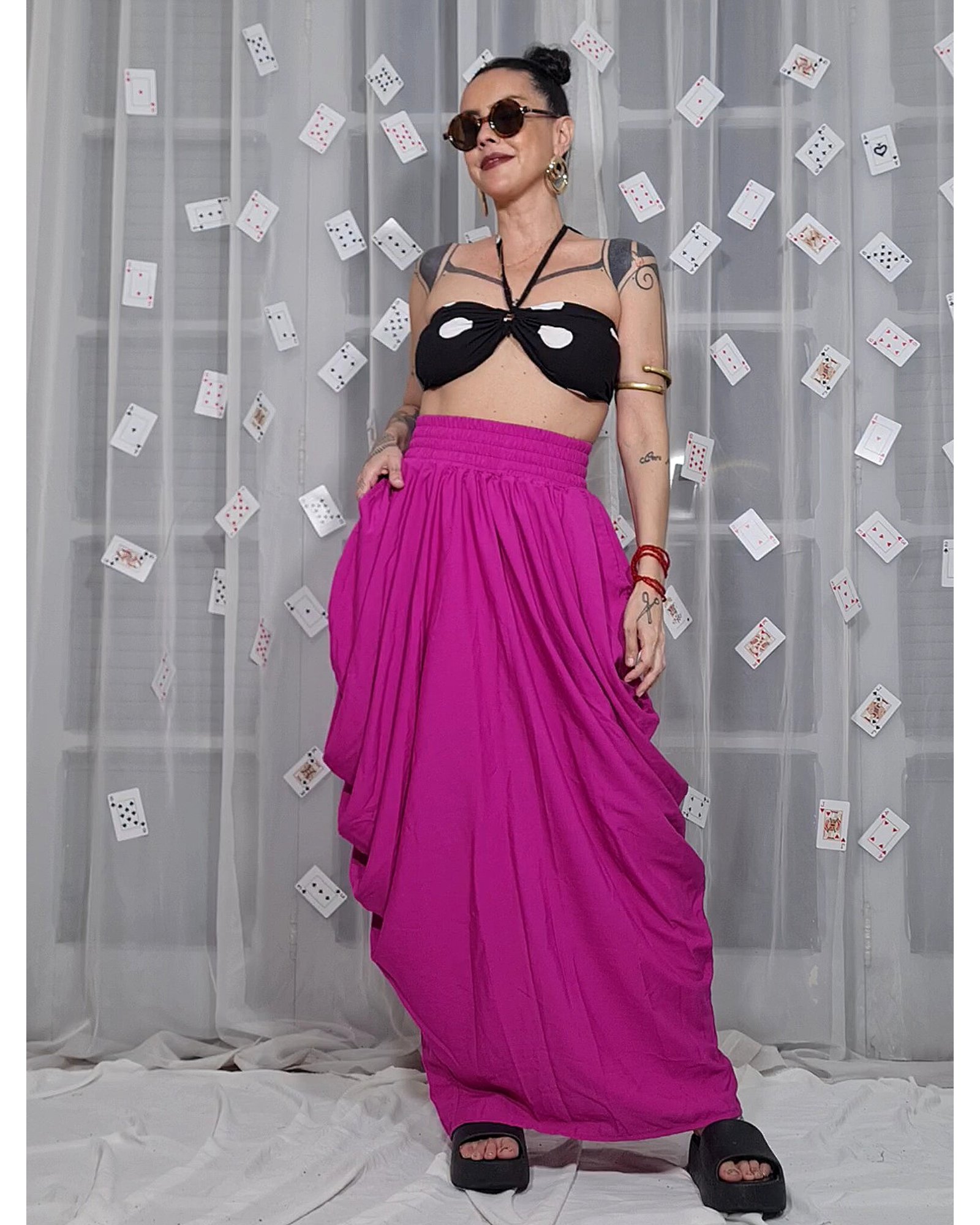 Saia que franze em cascata nas laterais e vai afunilando em baixo, estilo tulipa. Possui elástico de 8cm de largura na cintura, muito maleável, o que deixa a peça super adaptável ás medidas e confortável. Tem também bolsos nas laterais.