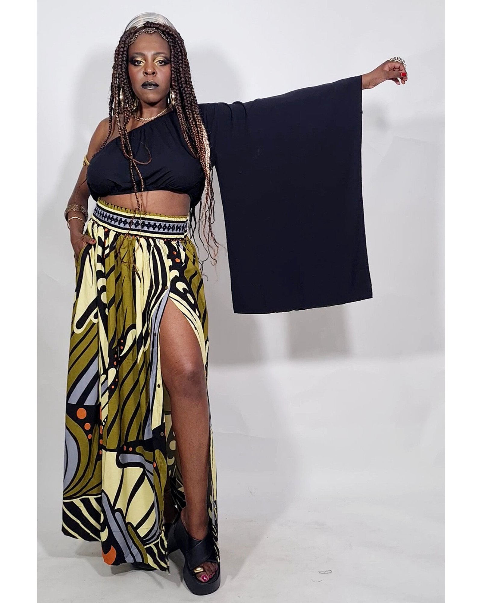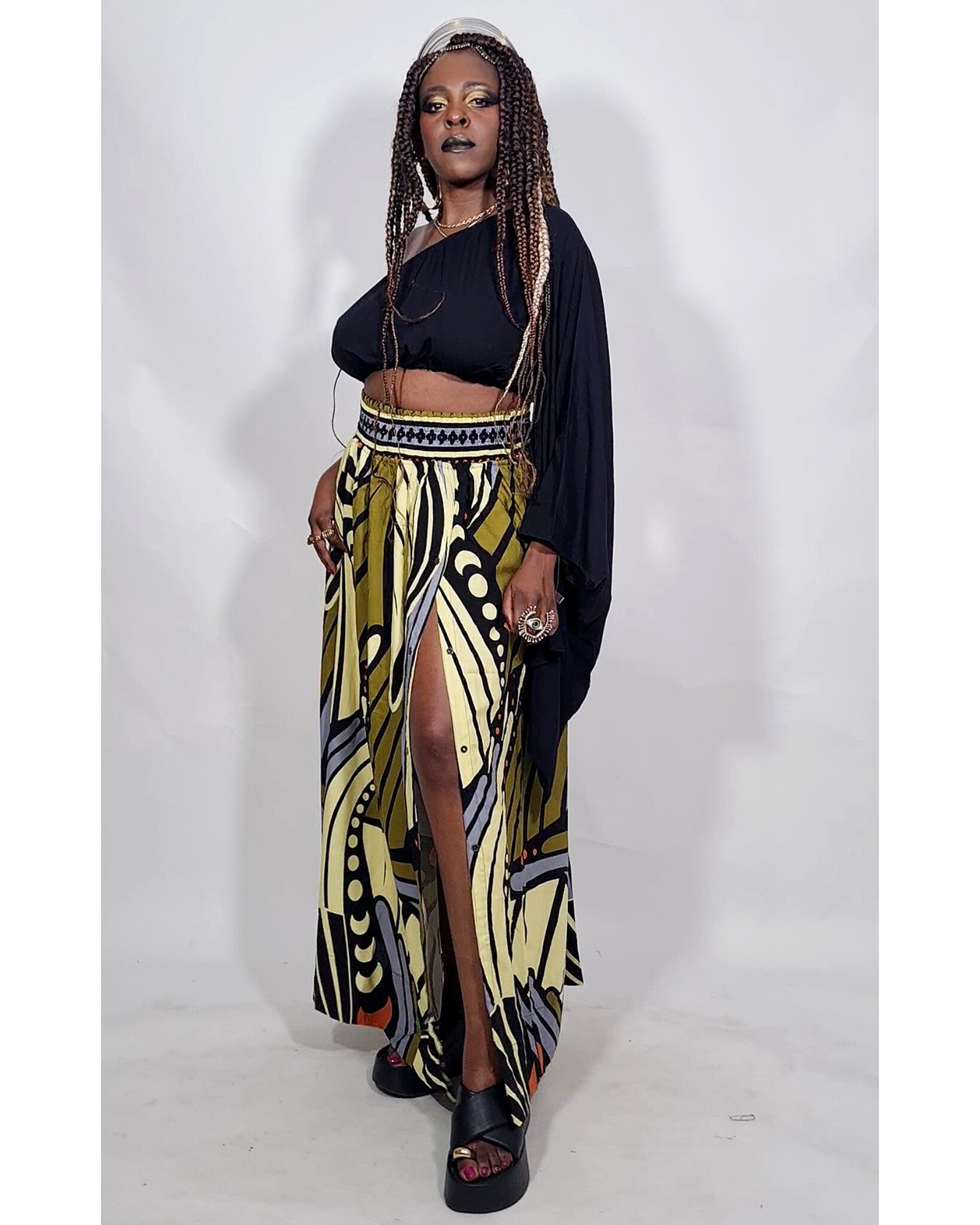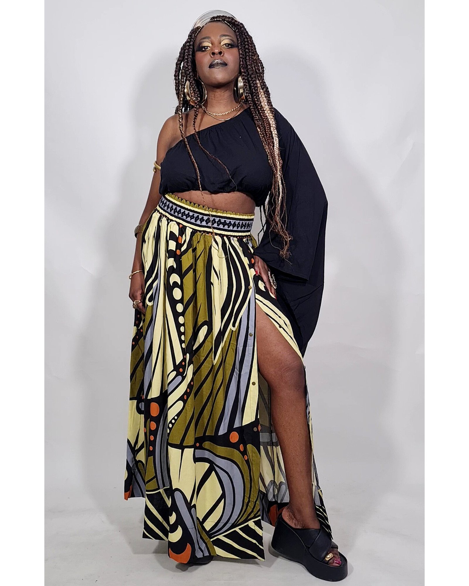 Saia Jasmim é super versátil, tem botões para vc regular o tamanho da fenda, elástico na cintura confortável e pode também ser usada como vestido tomara-que-caia, soltinho ou com cinto.