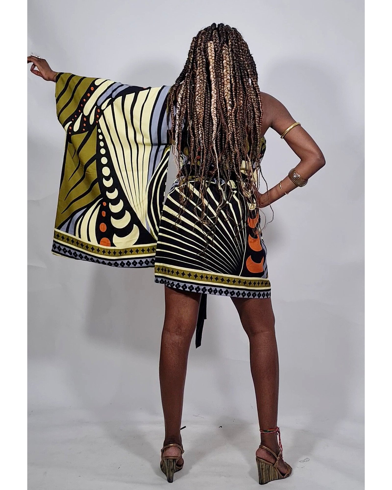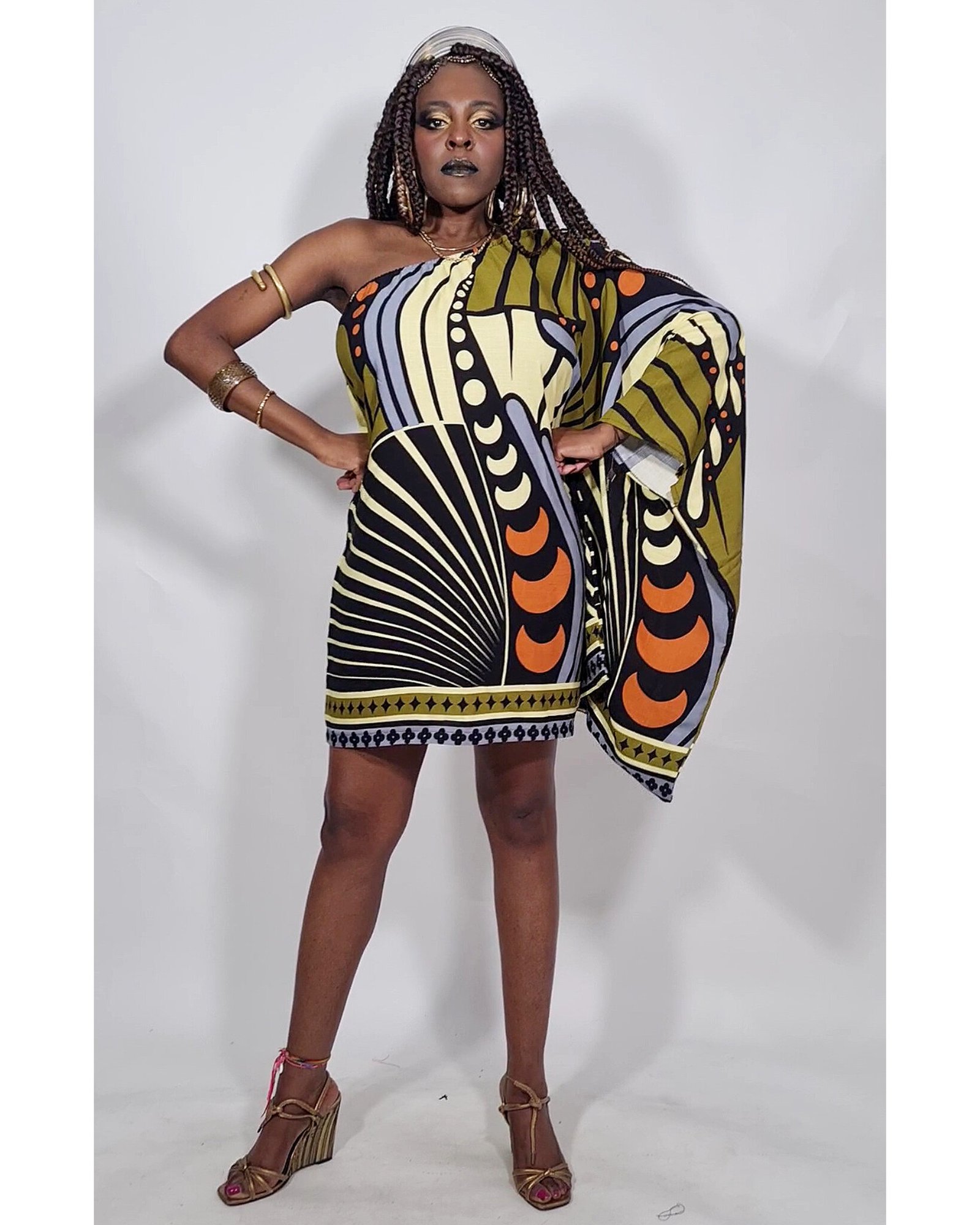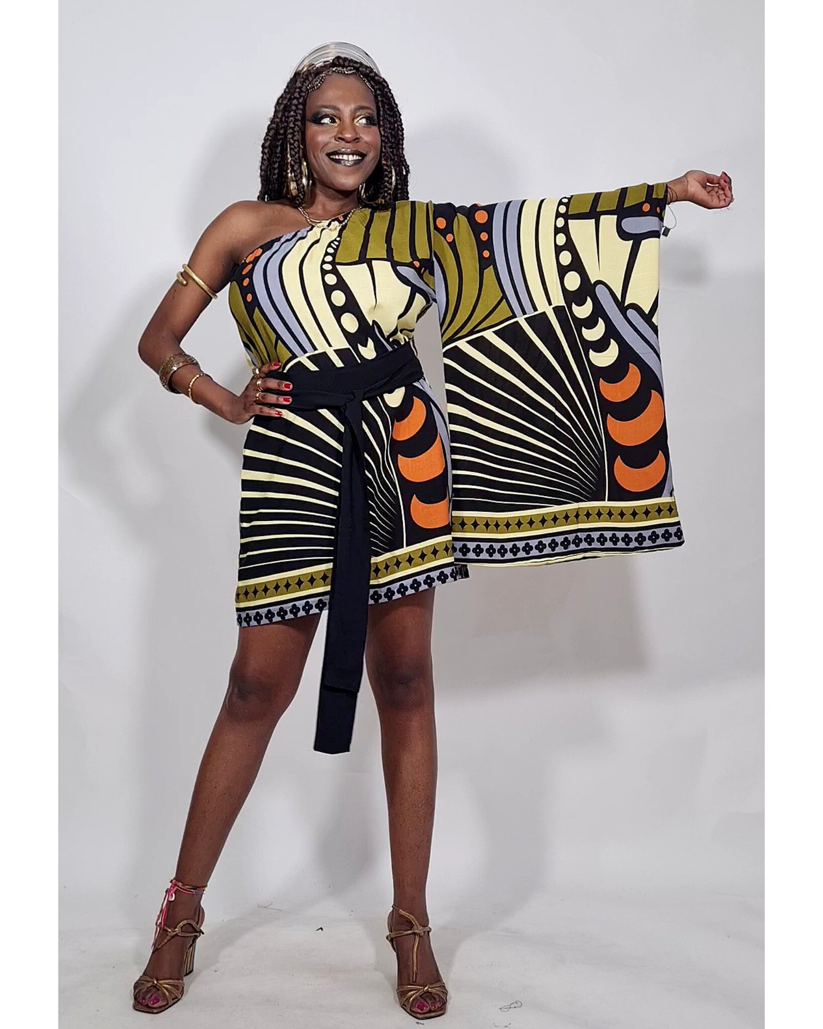 Vestido curto um-ombro-só com manga de kimono. Vem com cinto avulso para acinturar.