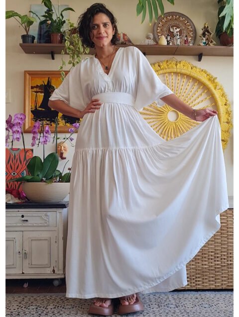 Todo o charme do um-ombro-só somado a manga dramática. Vem com cinto do próprio tecido para acinturar.
