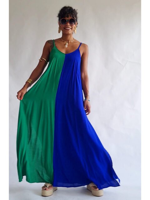 Vestido longo, evasê, com fendas nas laterais e alças reguláveis.